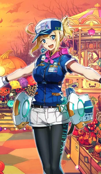 As for her appearance she is a 27-year-old Korean women, she wears a park worker outfit which contain a white and blue hat, a white and blue short sleeve shirt, a white short, a black stocking, and she is a short slim woman with blonde hair and blue colored eyes, during stage 1 Time Core she wears a different hat with a bikini, and a sandal, and a different shirt, and the rest of her stage she gains more mechanical parts but as for her special stage she shed all of her mechanical parts wearing black hat, blue scarf, a black sports bra with mechanical parts, a black fingerless opera gloves, a black high thigh socks, a black shoe, a black shorts, and mechanical parts around her waist.