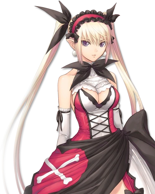 Myucel appears as young woman with red which has red, black and white colours along side two bones form cross in skirt left section. Myucel has long blonde hair, which she likes put in two long ponytails and purple colour eyes. She also keeps hers weapon, knife at hers left leg under skirt. In short Myucel has don`t come closer personality, if i don`t want it. Meaning she herself is open almost every one who she meets, talks what ever she herself has in mind. But if you go to her and try speak to her, she ignores you and usually gives cold look to you.